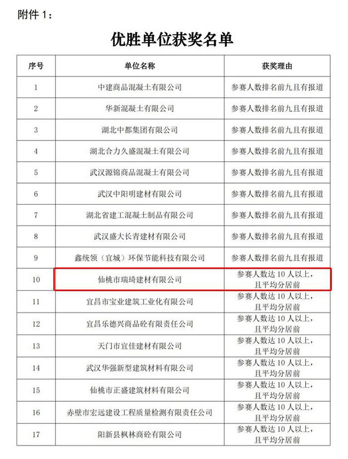 近日,根據(jù)湖北省預(yù)拌混凝土協(xié)會《關(guān)于公布“善諾律所杯”湖北省預(yù)拌混凝土(砂漿)企業(yè)質(zhì)量管理知識競賽比賽結(jié)果的通知》,仙桃市瑞琦建材有限公司以優(yōu)異成績榮獲優(yōu)勝單位;黃果輝、嚴(yán)俊、付習(xí)文榮獲優(yōu)秀個人一等獎,許智勇、李弦榮獲優(yōu)秀個人二等獎。...